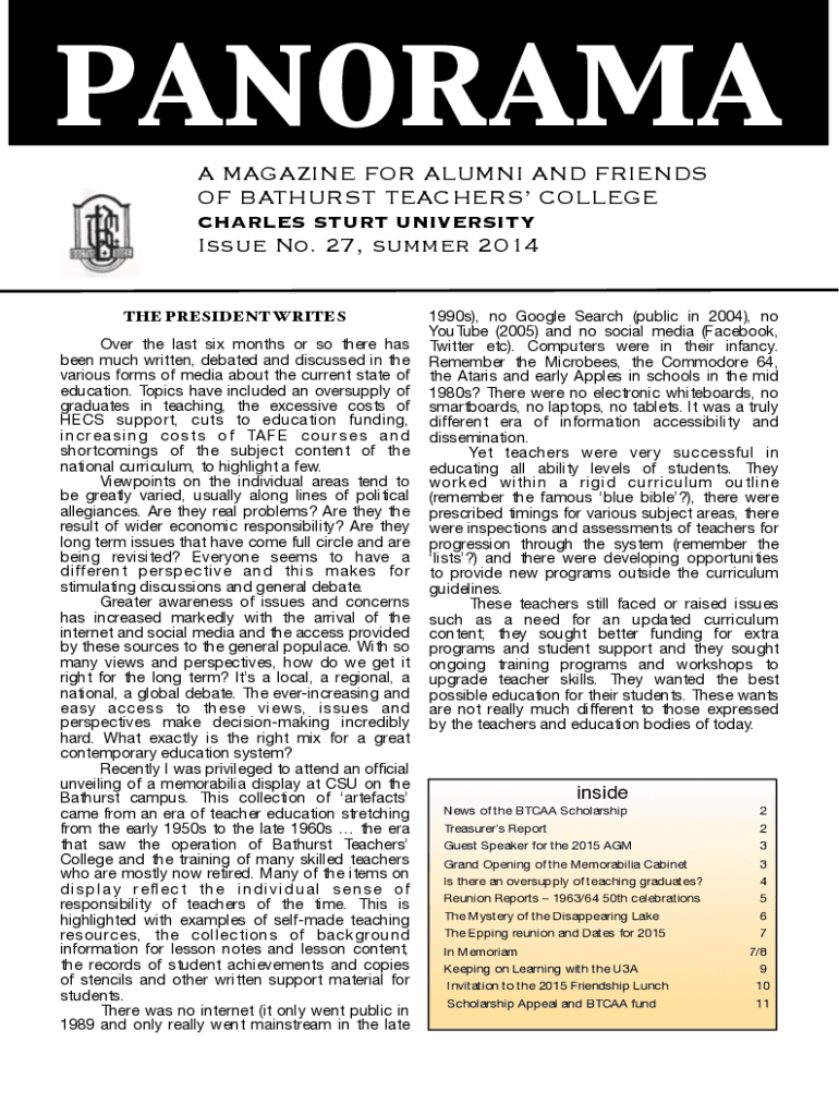 Panorama A MAGAZINE FOR ALUMNI AND FRIENDS OF BATHURST TEACHERS COLLEGE Charles start university Issue No. 27, summer 2014 THE PRESIDENT WRITES Over the last six months or so there has been much written,