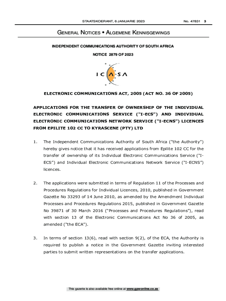 INDEPENDENT COMMUNICATIONS AUTHORITY OF SOUTH AFRICANIZE [] OF 2022NOTICE 2879 OF 2023ELECTRONIC COMMUNICATIONS