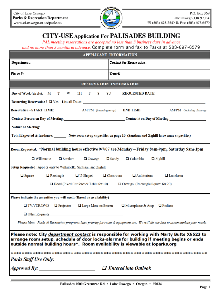 City of Lake OswegoParks & Recreation Department www.ci.oswego.or.us/parksrecP. O. Box 369 Lake Oswego, OR 97034 (503) 6752549 Fax: (503) 6976579CITYUSE Application For PALISADES BUILDING PAL meeting