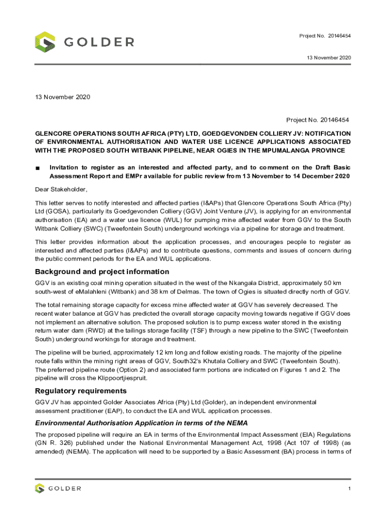 Project No. 2014645413 November 202013 November 2020 Project No. 20146454 GLENCOE OPERATIONS SOUTH AFRICA (PTY) LTD, GOEDGEVONDEN COLLIERY JV: NOTIFICATION OF ENVIRONMENTAL Authorization AND WATER