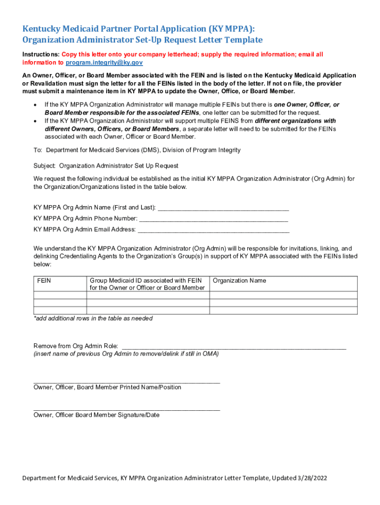 Kentucky Medicaid Partner Portal Application (KY MPA): Organization Administrator SetUp Request Letter Template Instructions: Copy this letter onto your company letterhead; supply the required information;