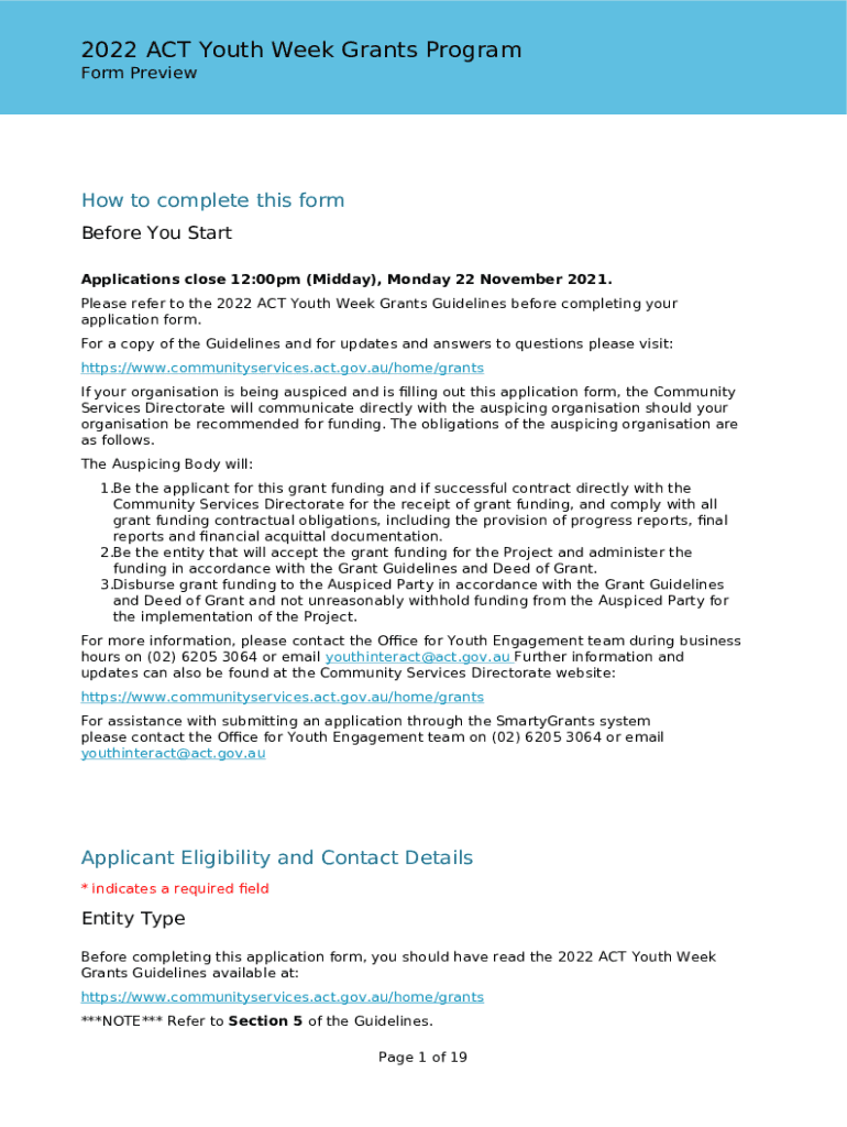 2022 ACT Youth Week Grants Program Form Preview to complete this form Before You Start Applications close 12:00pm (Midday), Monday 22 November 2021. Please refer to the 2022 ACT Youth Week Grants