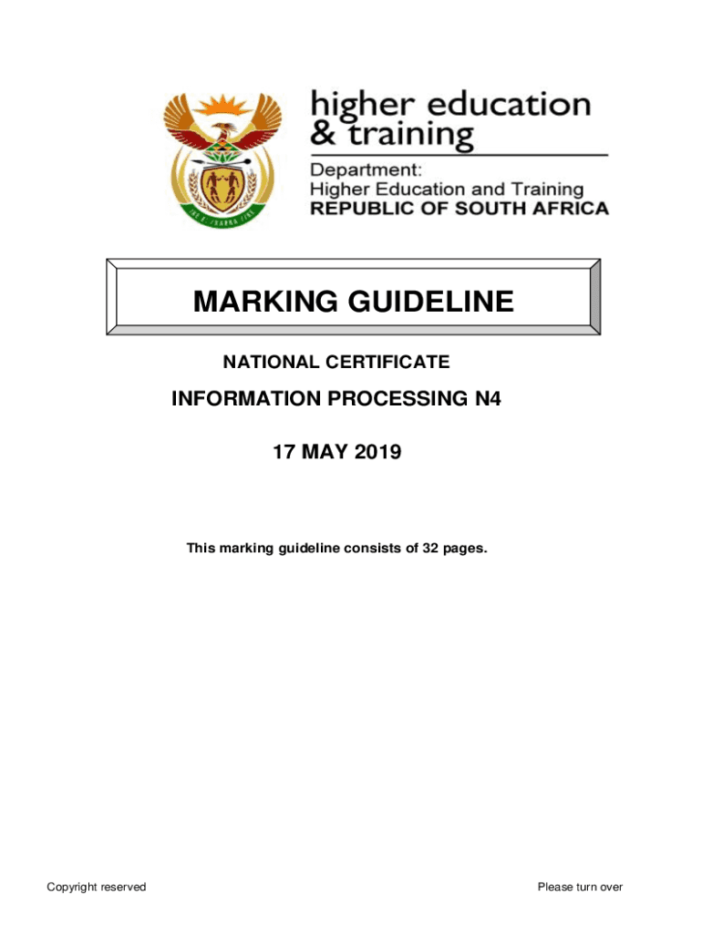 MARKING GUIDELINE NATIONAL CERTIFICATEINFORMATION PROCESSING N4 17 MAY 2019This marking guideline consists of 32 pages. Copyright reservedPlease turn overtaking GUIDELINE2INFORMATION PROCESSING N4GENERAL