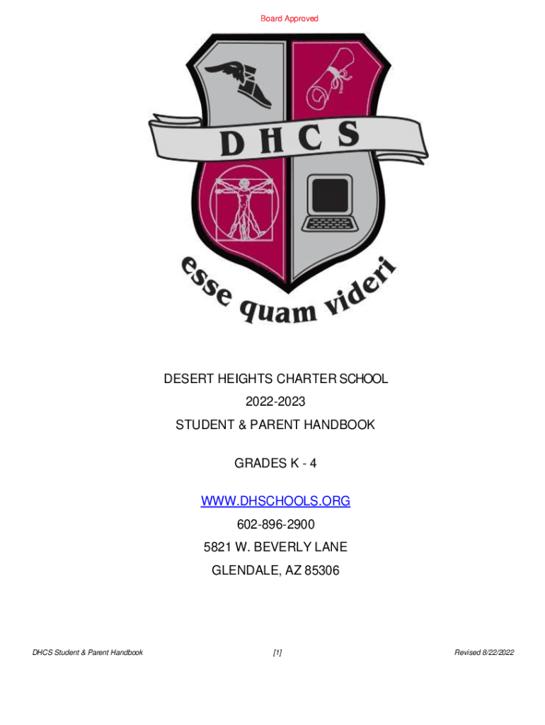 Board ApprovedDESERT HEIGHTS CHARTER SCHOOL 20222023 STUDENT & PARENT HANDBOOK GRADES K 4 WWW.SCHOOLS.ORG 6028962900 5821 W. BEVERLY LANE GLENDALE, AZ 85306DHCS Student & Parent Handbook[1]Revised
