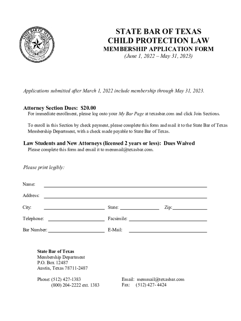 STATE BAR OF TEXAS CHILD PROTECTION MEMBERSHIP APPLICATION FORM (June 1, 2023, May 31, 2023)Applications submitted after March 1, 2023, include membership through May 31, 2023. Attorney Section Dues: