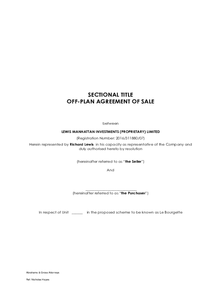 SECTIONAL TITLE PLAN AGREEMENT OF SALE between LEWIS MANHATTAN INVESTMENTS (PROPRIETARY) LIMITED (Registration Number: 2016/311880/07) Herein represented by Richard Lewis in his capacity as representative