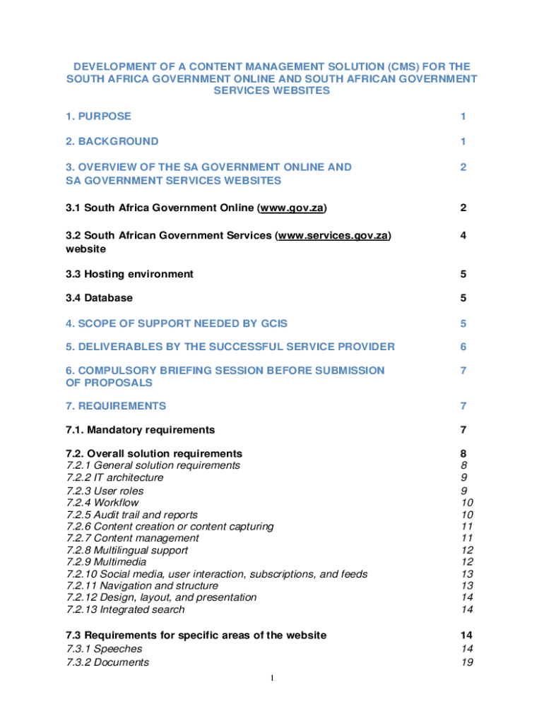 DEVELOPMENT OF A CONTENT MANAGEMENT SOLUTION (CMS) FOR THE SOUTH AFRICA GOVERNMENT ONLINE AND SOUTH AFRICAN GOVERNMENT SERVICES WEBSITES 1. PURPOSE12. BACKGROUND13. OVERVIEW OF THE SA GOVERNMENT ONLINE