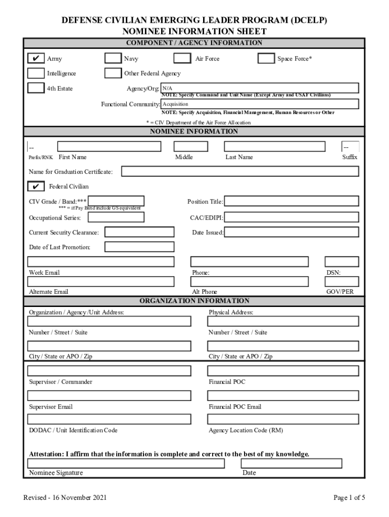 DEFENSE CIVILIAN EMERGING LEADER PROGRAM (DC ELP) NOMINEE INFORMATION SHEET COMPONENT / AGENCY INFORMATIONArmyNavyIntelligenceOther Federal Agency4th Estate Force Space Force×Agency/Org: N/NOTE: