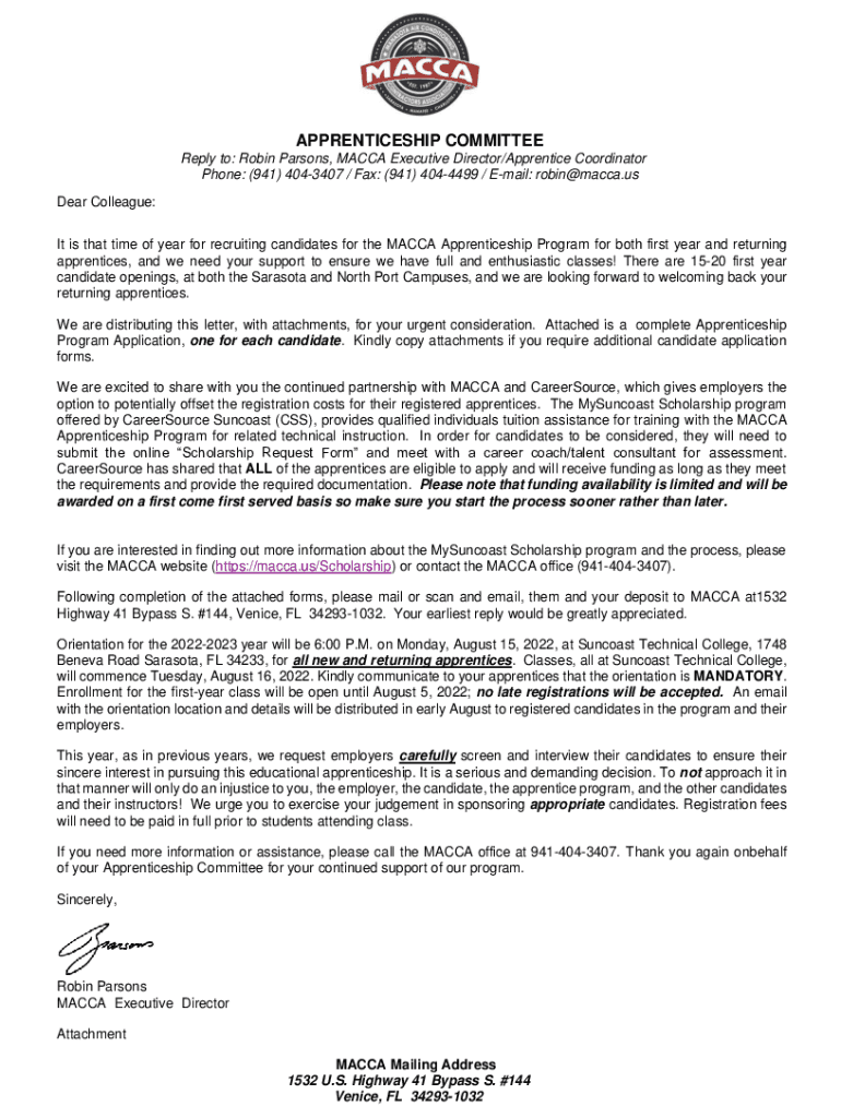 APPRENTICESHIP COMMITTEE Reply to: Robin Parsons, MECCA Executive Director/Apprentice Coordinator Phone: (941) 4043407 / Fax: (941) 4044499 / Email: robin@macca.us Dear Colleague: It is that time