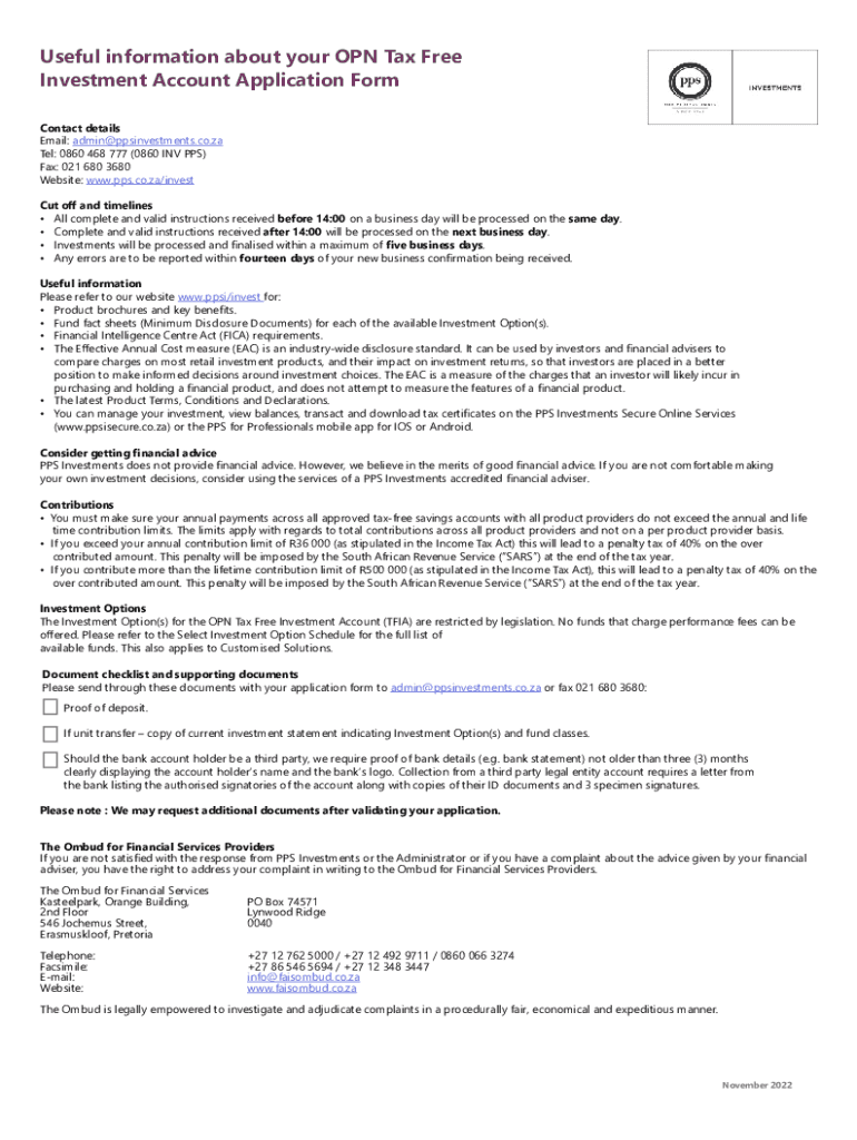 Useful information about your ON Tax Free Investment Account Application Form Contact details Email: admin@ppsinvestments.co.za Tel: 0860 468 777 (0860 IN PPS) Fax: 021 680 3680 Website: www.pps.co.za/invest