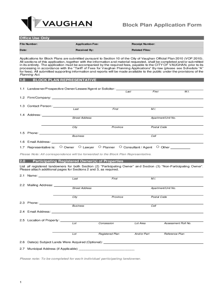 Block Plan Application Form Office Use Only File Number:Application Fee:Receipt Number:Date:Received By:Related Files:Applications for Block Plans are submitted pursuant to Section 10 of the City