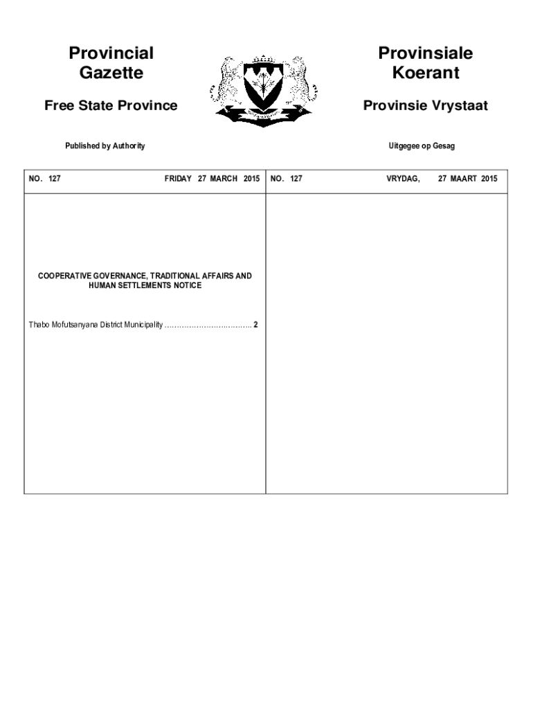 Provincial GazetteProvinsiale KoerantFree State ProvinceProvinsie VrystaatPublished by Authority NO. 127Uitgegee op GesagFRIDAY 27 MARCH 2015COOPERATIVE GOVERNANCE, TRADITIONAL AFFAIRS AND HUMAN SETTLEMENTS