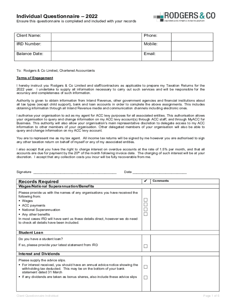 Individual Questionnaire 2022 Ensure this questionnaire is completed and included with your recordsClient Name:Phone:IRD Number:Mobile:Balance Date:Email:To: Rodgers & Co Limited, Chartered Accountants