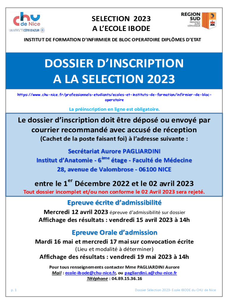 SELECTION 2023 A BECOME ABODE INSTITUTE DE FORMATION INFORMER DE BLOC OPERATOR DIPLOMAS DETATDOSSIER INSCRIPTION À la SELECTION 2023 https://www.chunice.fr/professionnelsetudiants/ecolesetinstitutsdeformation/infirmierdeblocoperatoireLa