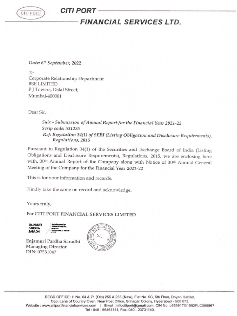 Gift PQ, n_.SCIFI PORT ___FINANCIAL SERVICES LTD. Date: 6 all September 2022 Corporate Relationship Department BSE LIMITED P JT owe rs, Daley Street, Mumbai40000lDea r Sir, Sub: Sulfur:still of AlI1l11al