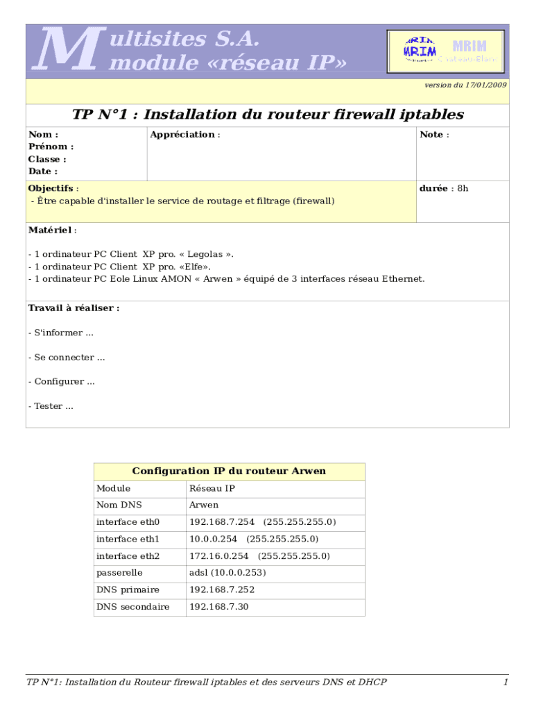 Multi sites S.A. module Roseau IP version Du 17/01/2009TP N1 : Installation Du router firewall iptables Not : Prom : Class : Date :Appreciation :Objectify : TRE capable d\'installer LE service DE