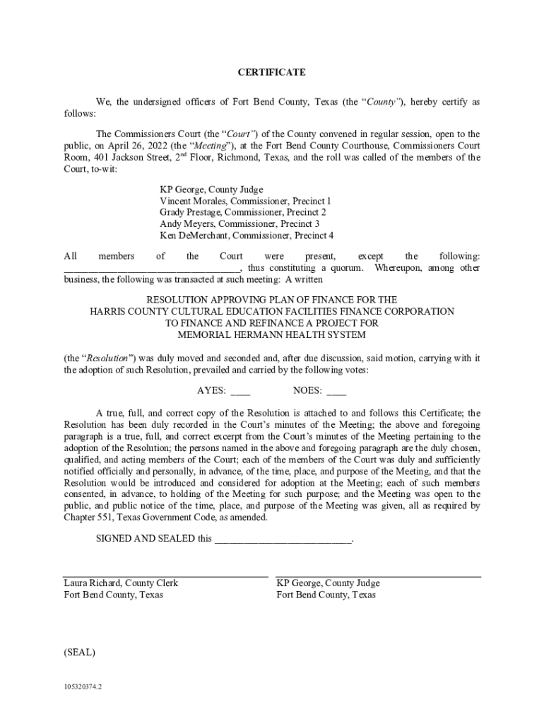 CERTIFICATE We, the undersigned officers of Fort Bend County, Texas (the County), hereby certify as follows: The Commissioners Court (the Court) of the County convened in regular session, open to