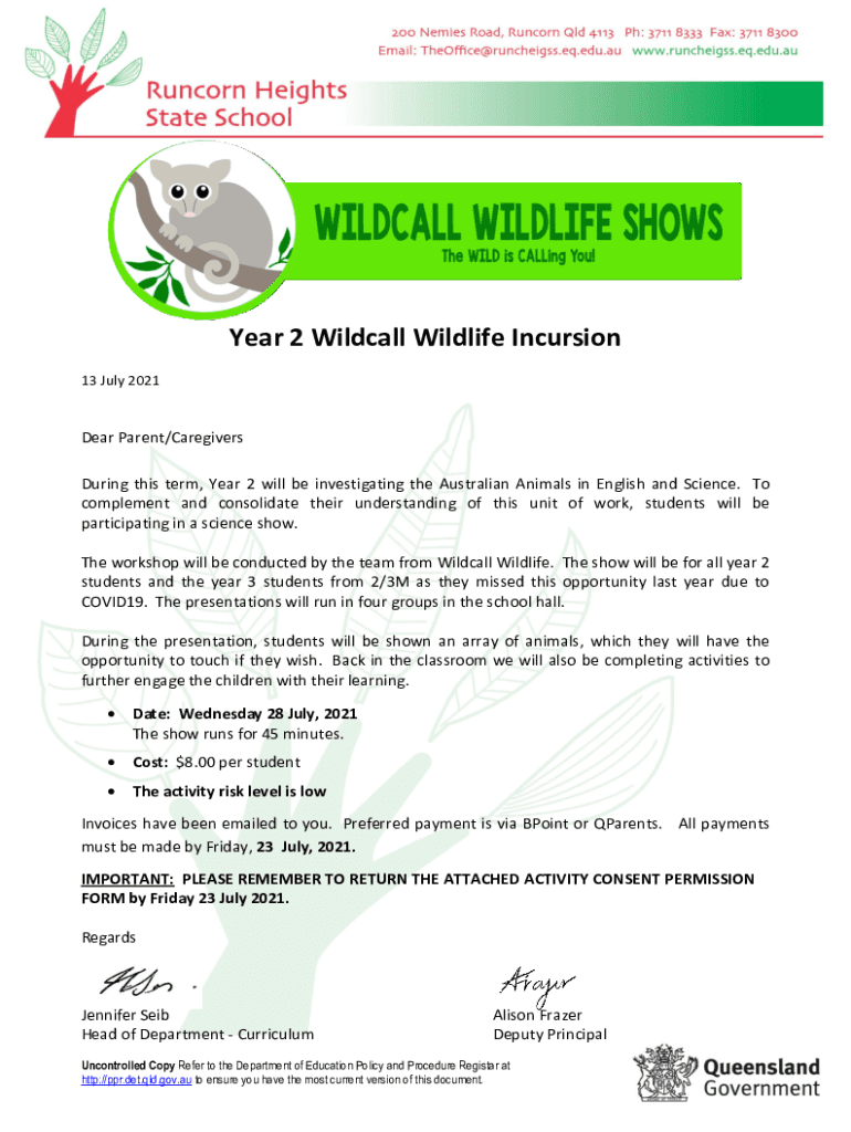 Year 2 Wild call Wildlife Incursion 13 July 2021Dear Parent/Caregivers During this term, Year 2 will be investigating the Australian Animals in English and Science. To complement and consolidate their