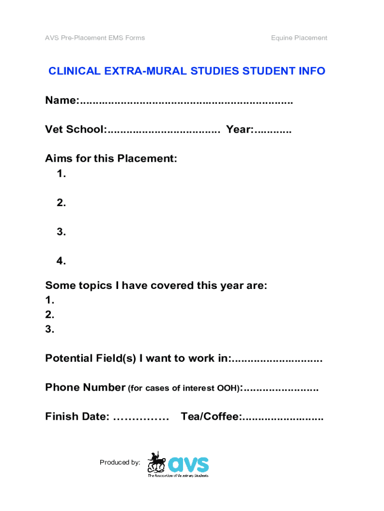 AVS Replacement EMS FormsEquine PlacementCLINICAL EXTRAMURAL STUDIES STUDENT INFO Name:.................................................................... Vet School:....................................