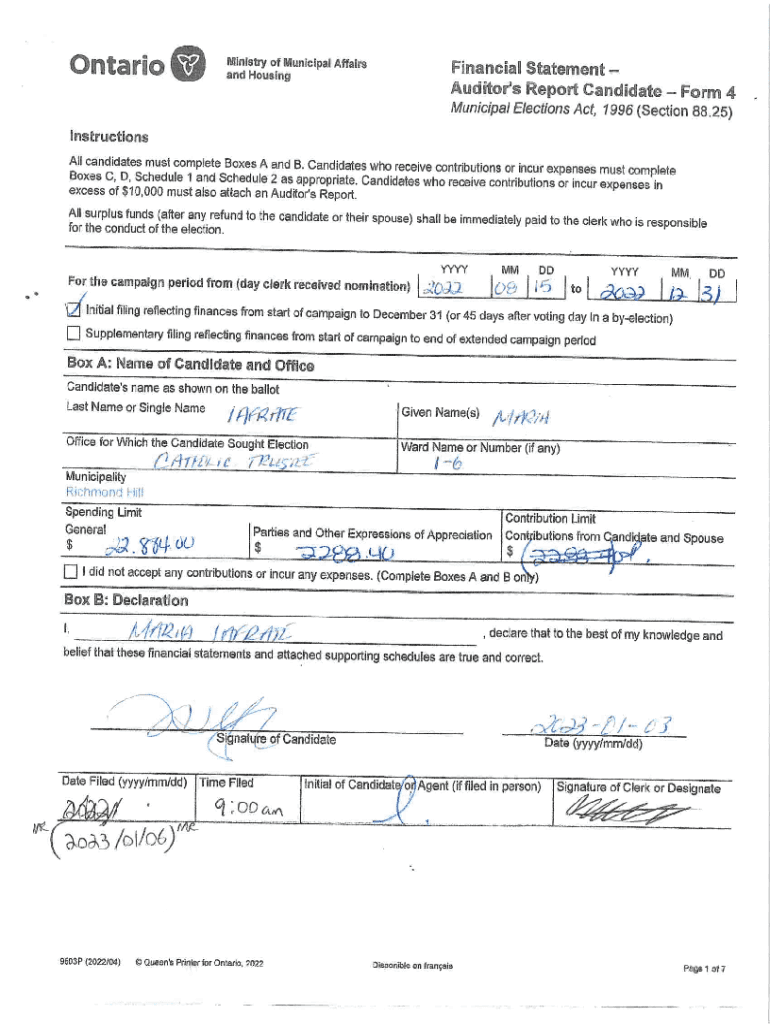 Financial Statement Auditor\'s Report Candidate Form 4 Municipal Elections Act, 1996 (Section 88.25) Instructions All candidates must complete Boxes A and B. Candidates who receive contributions or