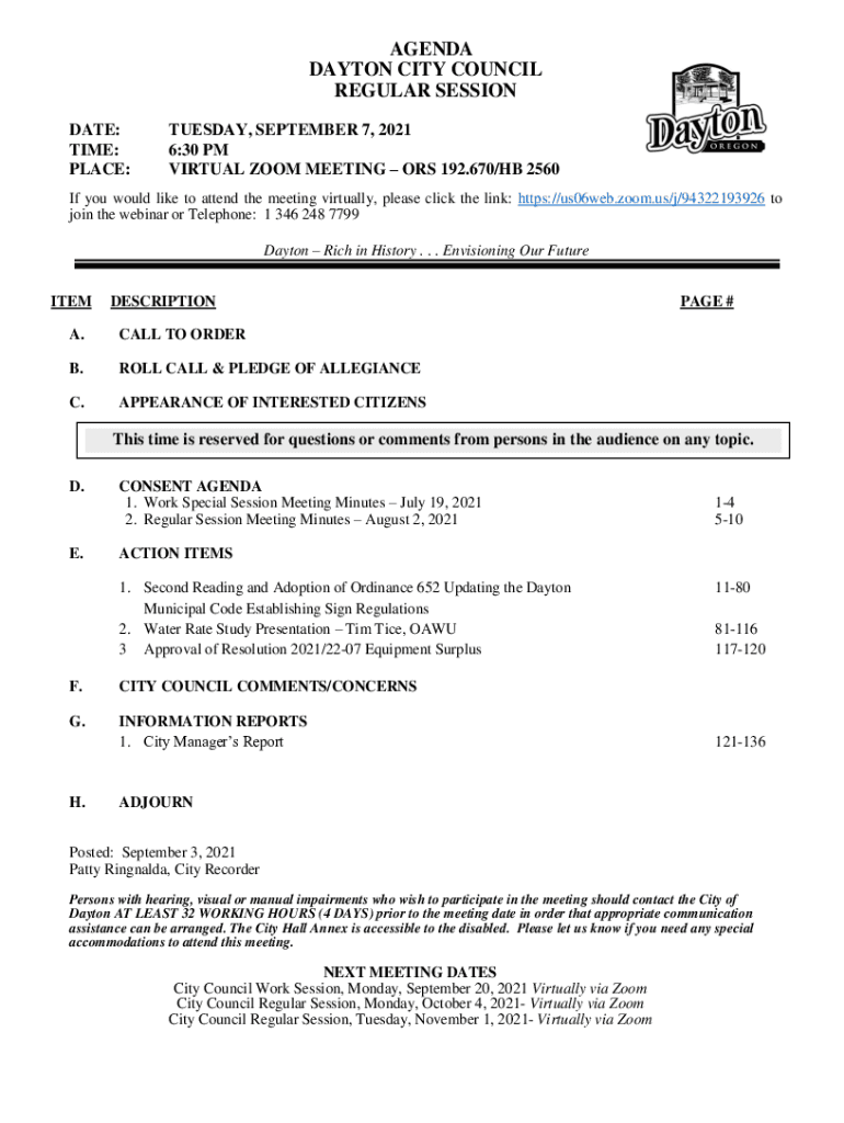 AGENDA DAYTON CITY COUNCIL REGULAR SESSION DATE: TIME: PLACE:TUESDAY, SEPTEMBER 7, 2021 6:30 PM VIRTUAL ZOOM MEETING ORS 192.670/HB 2560If you would like to attend the meeting virtually, please click