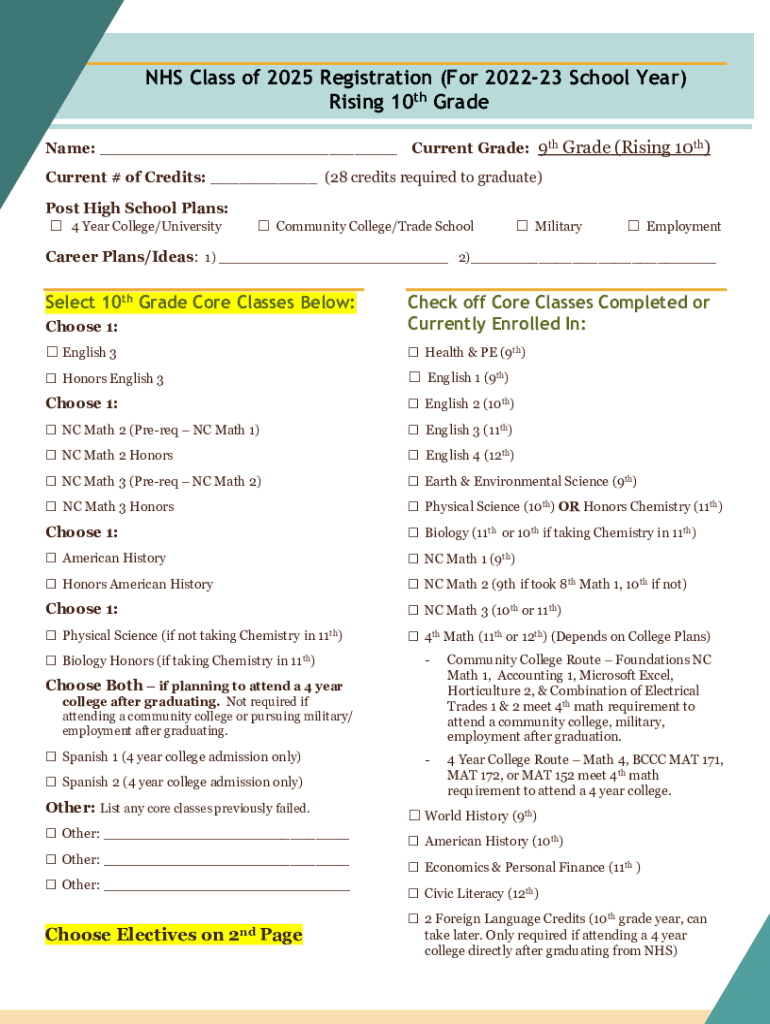 NHS Class of 2025 Registration (For 202223 School Year) Rising 10th Grade5Name: ___ Current Grade: 9th Grade (Rising 10th) Current # of Credits: ___ (28 credits required to graduate) Post High School