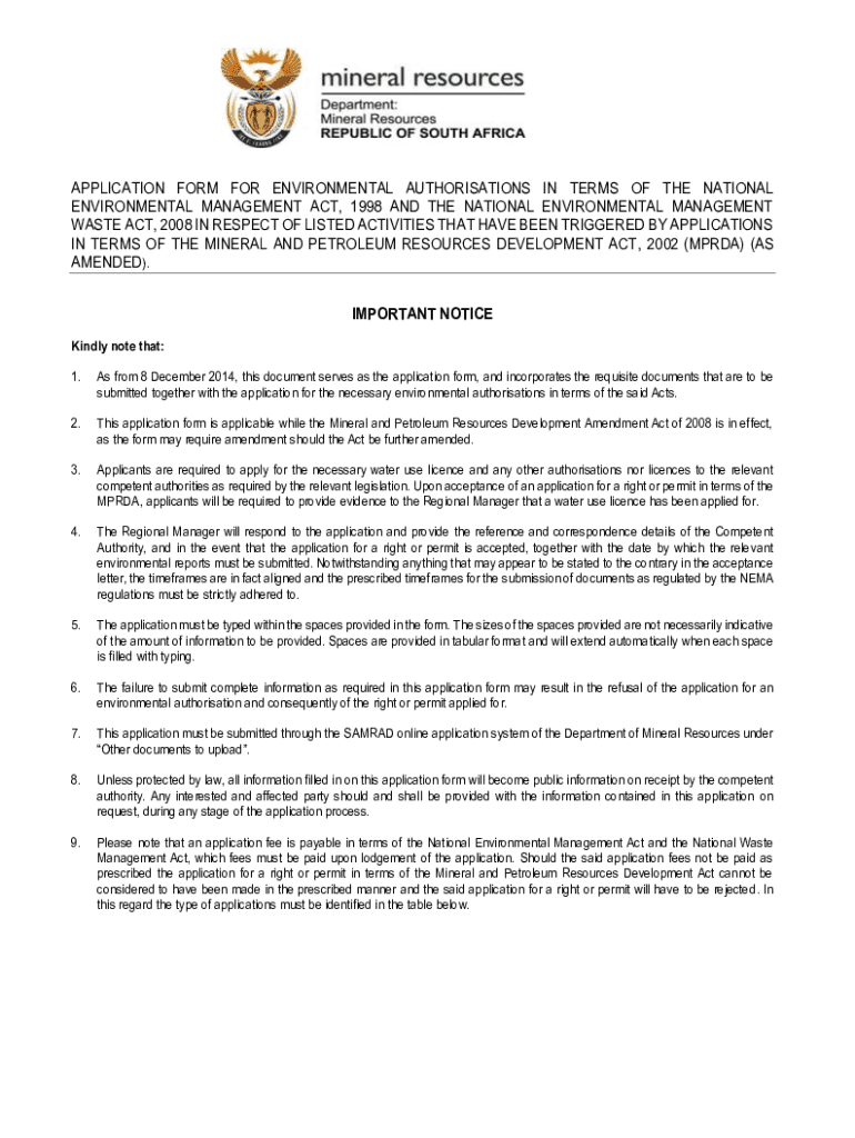 APPLICATION FORM FOR ENVIRONMENTAL Authorizations IN TERMS OF THE NATIONAL ENVIRONMENTAL MANAGEMENT ACT, 1998 AND THE NATIONAL ENVIRONMENTAL MANAGEMENT WASTE ACT, 2008 IN RESPECT OF LISTED ACTIVITIES