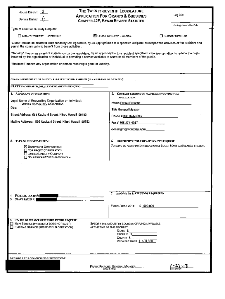 Application FOR GRANTS & Subsidies No:CHAPTER 42F, HAWAII REVISED STATUTES