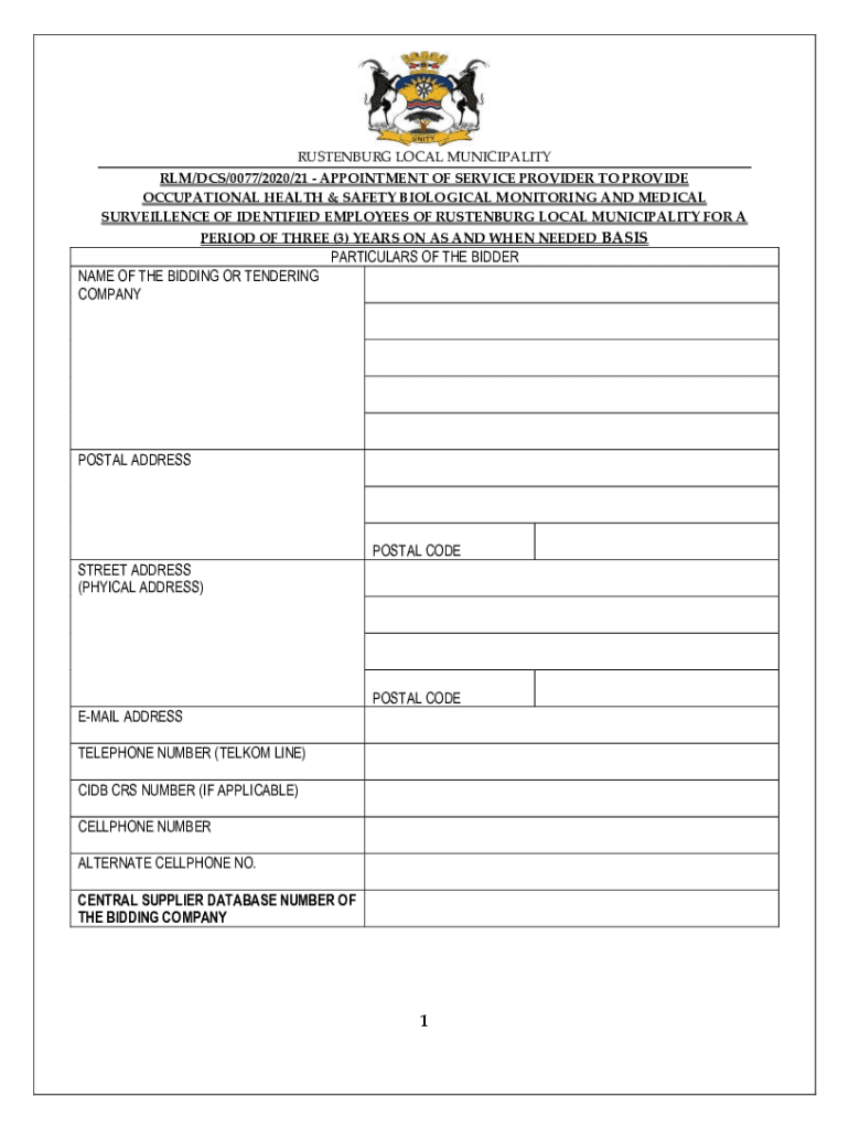 ROSENBERG LOCAL MUNICIPALITY RIM/DCS/0077/2020/21 APPOINTMENT OF SERVICE PROVIDER TO PROVIDE OCCUPATIONAL HEALTH & SAFETY BIOLOGICAL MONITORING AND MEDICAL SURVEILLANCE OF IDENTIFIED EMPLOYEES OF