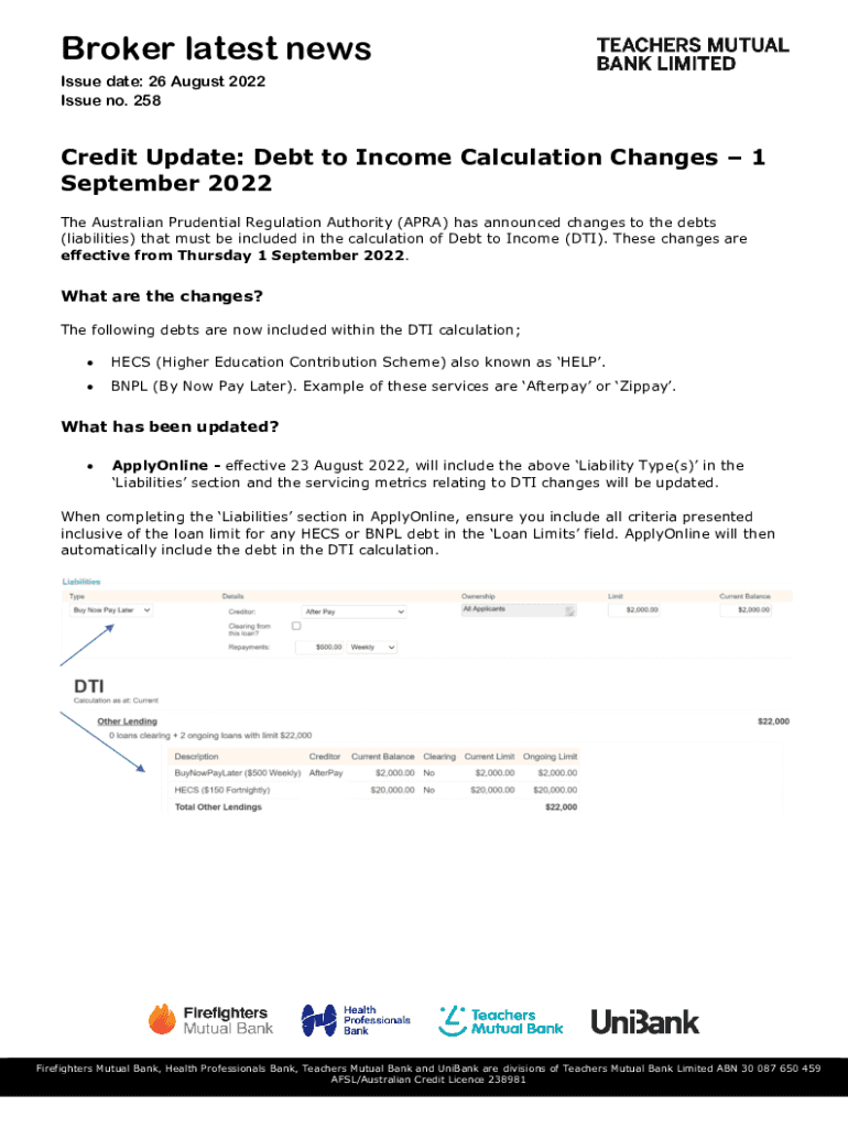 Broker the latest news Issue date: 26 August 2023 Issue no. 258Credit Update: Debt to Income Calculation Changes 1 September 2023 The Australian Prudential Regulation Authority (APA) has announced