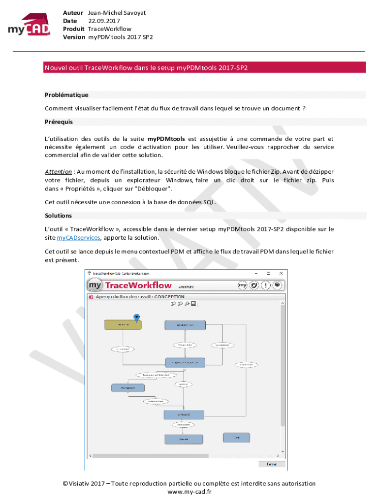 Auteur Date Product VersionJeanMichel Savoy at 22.09.2017 TraceWorkflow myPDMtools 2017 SP2Nouvel out TraceWorkflow days LE setup myPDMtools 2017SP2Problmatique Comment visualizer excitement l\'that