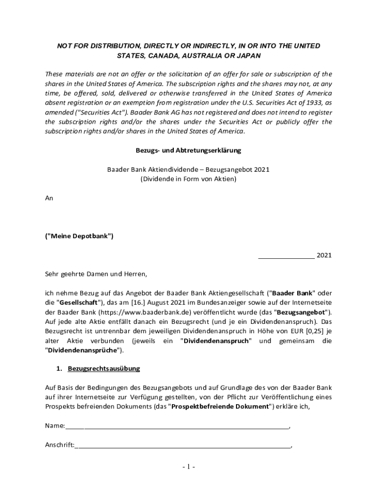 NOT FOR DISTRIBUTION, DIRECTLY OR INDIRECTLY, IN OR INTO THE UNITED STATES, CANADA, AUSTRALIA OR Japanese materials are not an offer or the solicitation of an offer for sale or subscription of the