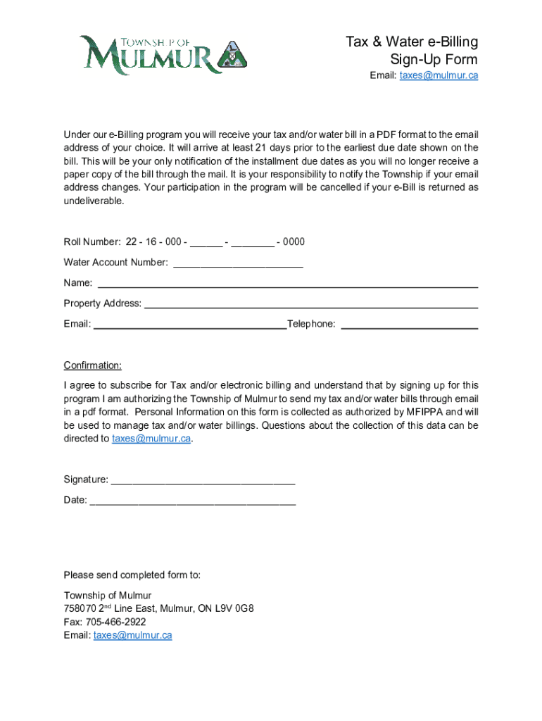 Tax & Water billing Sign-up Foresail: taxes@mulmur.caUnder our billing program you will receive your tax and/or water bill in a PDF format to the email address of your choice. It will arrive at least