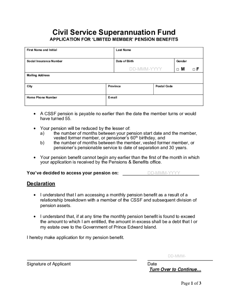 Civil Service Superannuation Fund APPLICATION FOR LIMITED MEMBER PENSION BENEFITS First Name and Initially Asocial Insurance Numerate of BirthGenderDDMMMYYYY MFM ailing AddressCityProvinceHome Phone