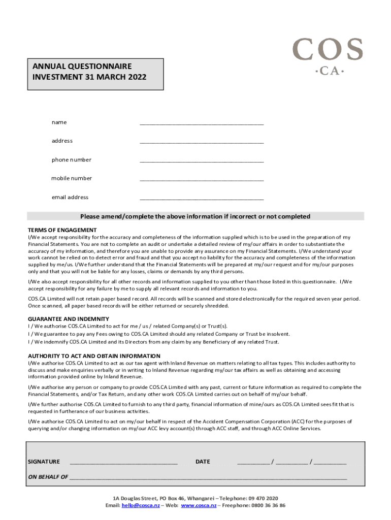 ANNUAL QUESTIONNAIRE INVESTMENT 31 MARCH 2022name___address___phone number___mobile number___email address___Please amend/complete the above information if incorrect or not completed TERMS OF ENGAGEMENT