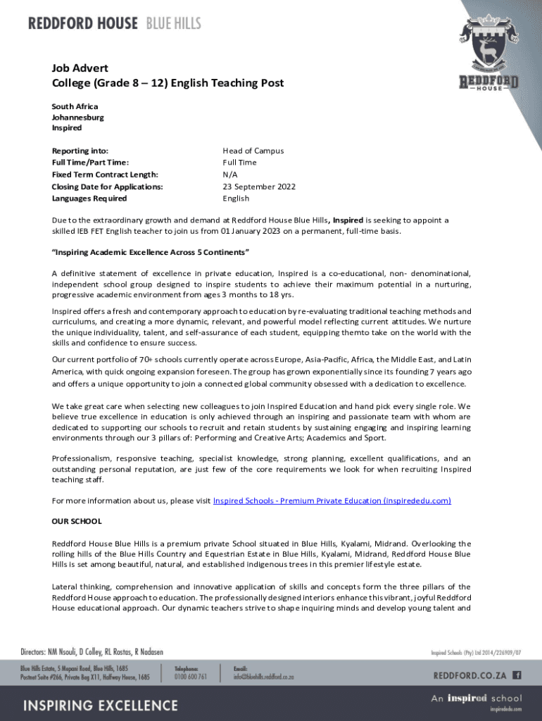 Job Advert College (Grade 8 12) English Teaching Post South Africa Johannesburg Inspired Reporting into: Full Time/Part Time: Fixed Term Contract Length: Closing Date for Applications: Languages Required