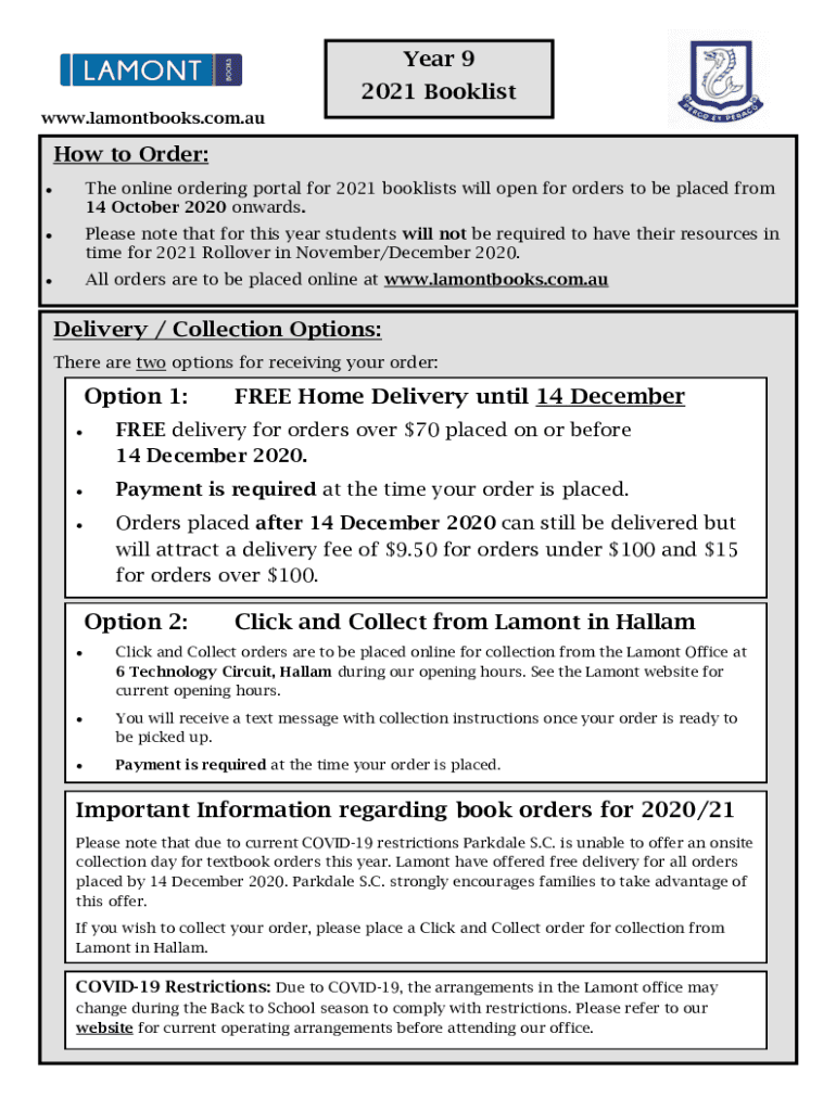 Year 92021 Book list www.lamontbooks.com.auHow to Order: The online ordering portal for 2021 book lists will open for orders to be placed from 14 October 2020 onwards. Please note that for this year