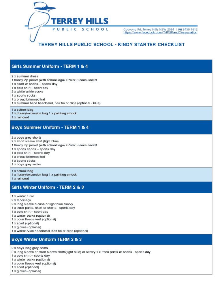 TERRY HILLS PUBLIC SCHOOL UNIFORM SHOP ORDER Formats://www.facebook.com/THPSPandCAssociationTERREY HILLS PUBLIC SCHOOL KIND STARTER CHECKLISTGirls Summer Uniform TERM 1 & 4