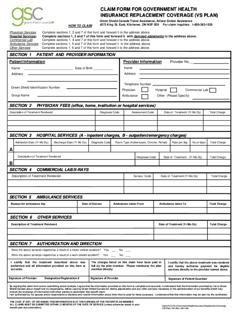 CLAIM FORM FOR GOVERNMENT HEALTH INSURANCE REPLACEMENT COVERAGE (VS PLAN) HOW TO CLAIM Physician Services: Hospital Services: Commercial Lab: Ambulance Services: Other Services:SECTION 1Green Shield