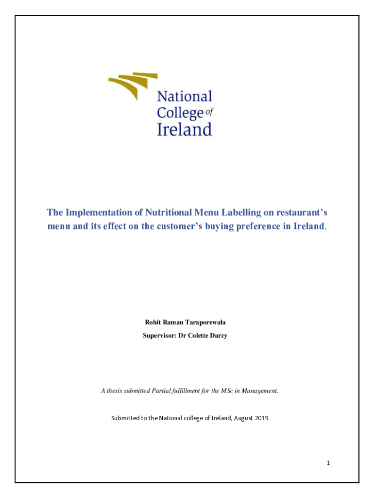 The Implementation of Nutritional Menu Labelling on restaurants menu and its effect on the customers buying preference in Ireland. Rohit Roman Taraporewala Supervisor: Dr Colette Darcy thesis submitted