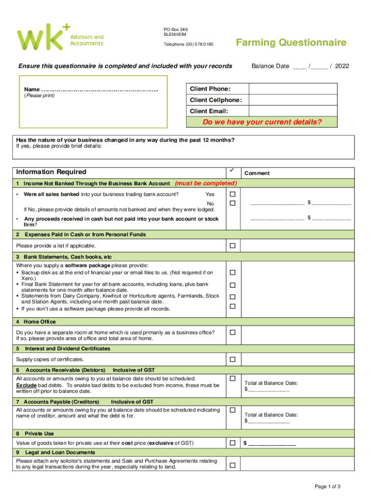 BLENHEIMFarming QuestionnaireTelephone (03) 578 0180Ensure this questionnaire is completed and included with your recordsName.
