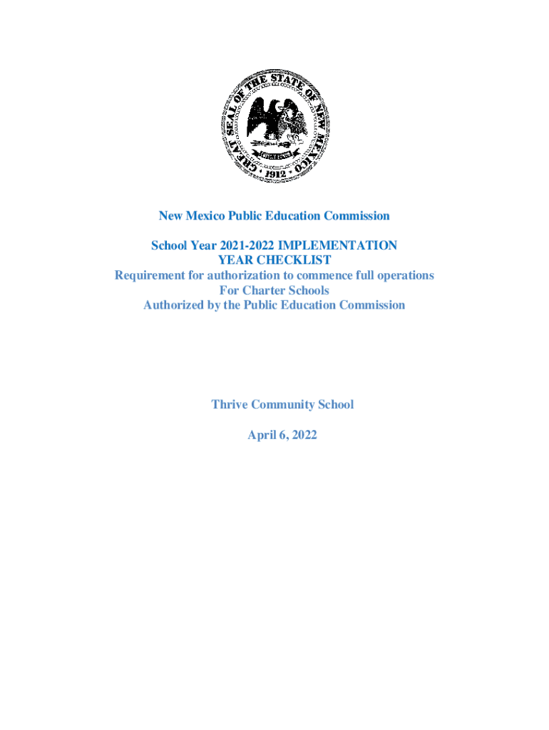 New Mexico Public Education Commission School Year 20212022 IMPLEMENTATION YEAR CHECKLIST Requirement for authorization to commence full operations For Charter Schools Authorized by the Public Education