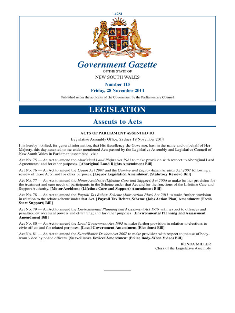 4281Government Gazette THE STATE ONE SOUTH WALESNumber 115Friday, 28 November 2014Published under the authority of the Government by the Parliamentary CounselLEGISLATION