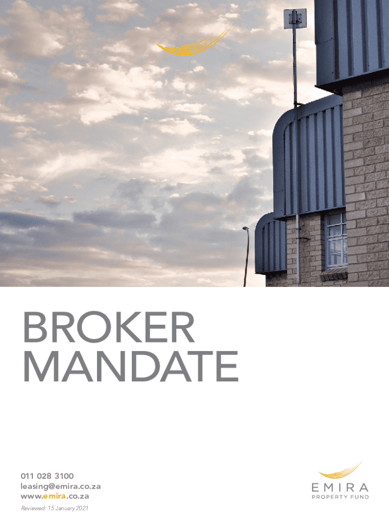 BROKER MANDATE 011 028 3100 leasing@emira.co.za www.emira.co.za Reviewed: 15 January 2021BROKER MANDATE (a)This mandate sets out the standard terms and conditions upon which Mira Property Fund Limited,