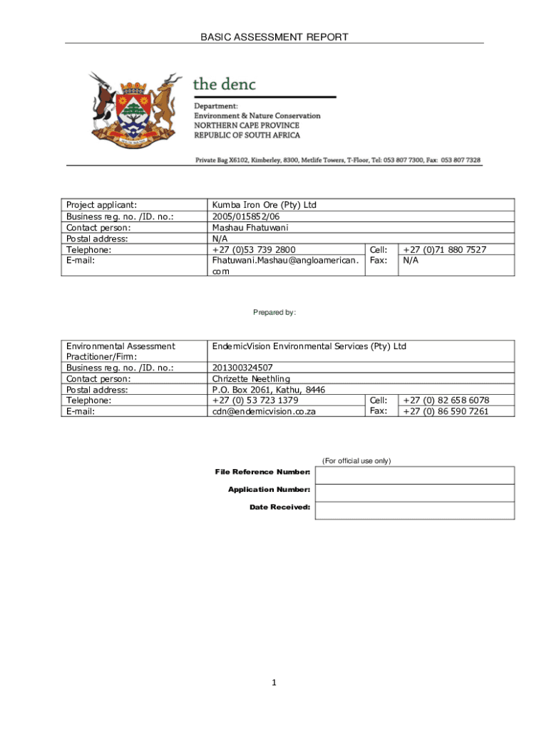 BASIC ASSESSMENT REPORTProject applicant: Business reg. No. /ID. No.: Contact person: Postal address: Telephone: Email:Rumba Iron Ore (Pty) Ltd 2005/015852/06 Marshal Fhatuwani N/A +27 (0)53 739 2800