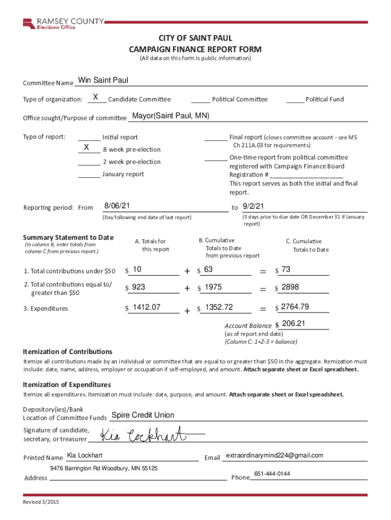 CITY OF SAINT PAUL CAMPAIGN FINANCE REPORT FORM (All data on this form is public information)Committee Name Win Saint Paul Candidate Committee Type of organization: ______ Political Committee___ Political