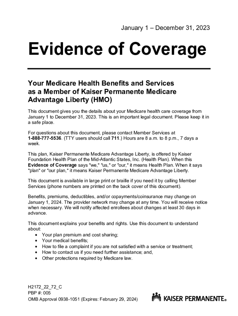 January 1 December 31, 2023Evidence of Coverage Your Medicare Health Benefits and Services as a Member of Kaiser Permanent Medicare Advantage Liberty (HMO) This document gives you the details about