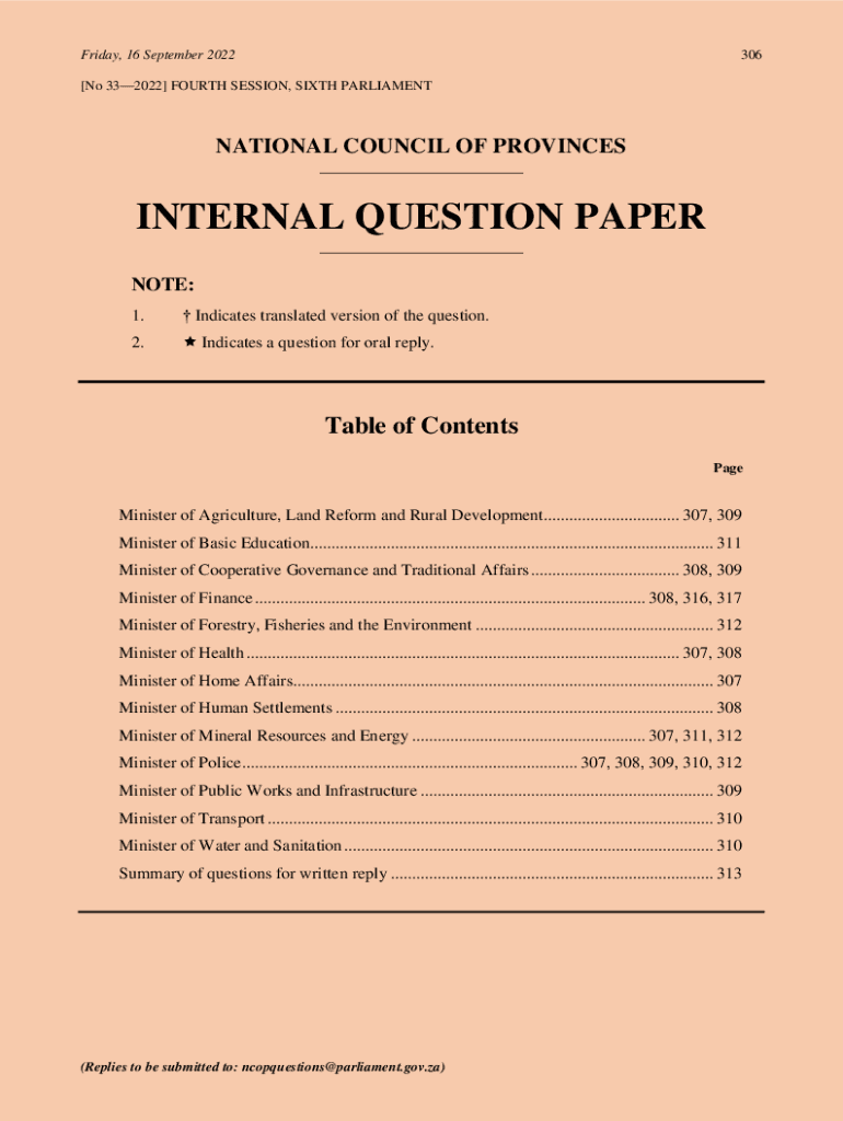 Friday, 16 September 2022306[No 332022] FOURTH SESSION, SIXTH PARLIAMENTNATIONAL COUNCIL OF PROVINCES ___INTERNAL QUESTION PAPER ___NOTE: 1. Indicates translated version of the question.2. Indicates