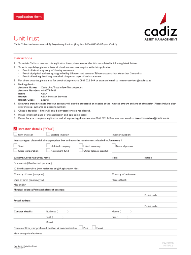 Application community Trust Cadiz Collective Investments (RF) Proprietary Limited (Reg. No. 2004/032263/07) (t/a Cadiz)Instructions 1. To enable Cadiz to process this application form, please ensure