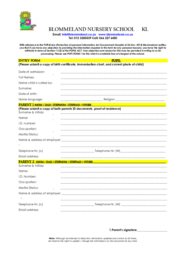 Get the free Vorms / Forms - Blommeland Kleuterskool